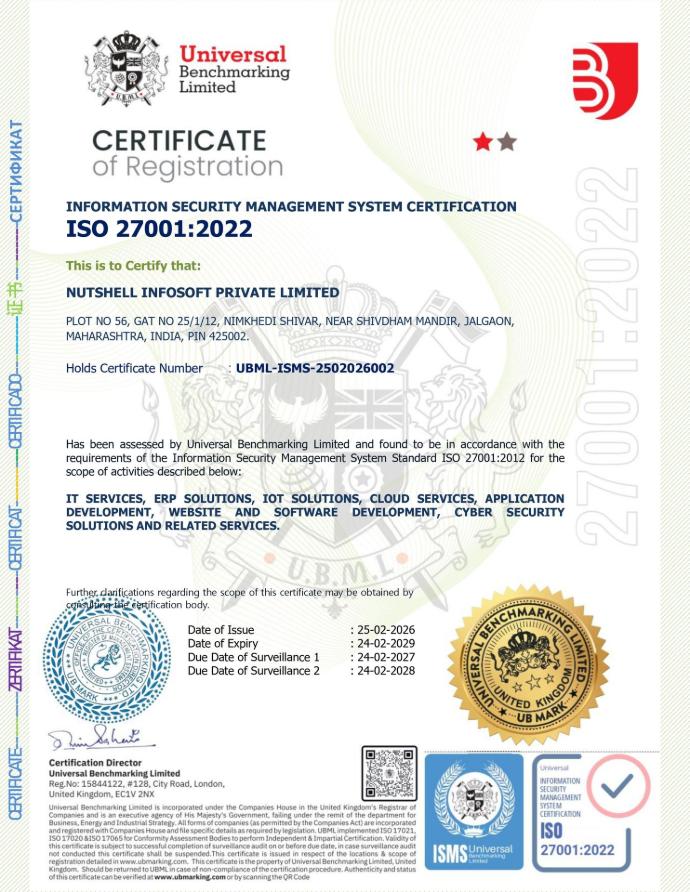 In 2021, Nutshell Infosoft transitioned into a Private Limited Company, marking a significant milestone in our journey of growth, expansion, and organizational maturity. Further strengthening our commitment to excellence and security, the company achieved ISO 27001 certification in 2023, demonstrating our dedication to maintaining the highest standards of information security management and data protection. Our robust security frameworks and best practices ensure that our clientsโ sensitive information remains protected against evolving cyber threats while maintaining the highest levels of confidentiality, integrity, and compliance.